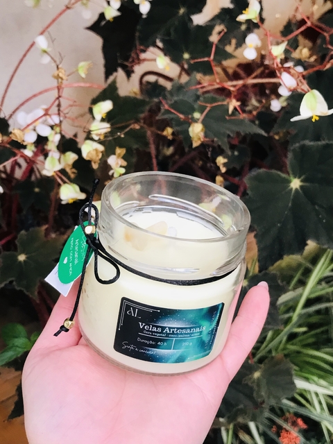 Vela artesanal em cera vegetal ( coco, palma e arroz), e pavio 100% algodão.